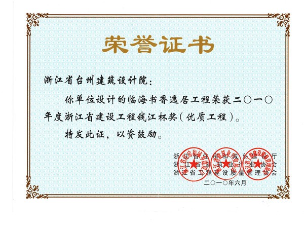 書香逸居工程獲2010浙江省建設工程錢江杯獎(優質工程)