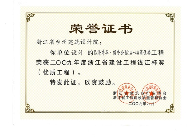 檀香公館1#~4#商住樓工程獲2009浙江省建設工程錢江杯獎(優質工程)